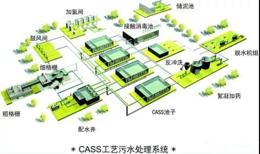 CASS(Cyclic Activated Sludge System)工藝是近年來國際公認的處理生活污水及廢水的先進工藝之一。其基本結構是:在序批式活性污泥法(SBR)的基礎上,反應池沿池長方向設計為兩部分,前部為生物選擇區(qū)也稱預反應區(qū),后部為主反應區(qū),其主反應區(qū)后部安裝了可升降的自動撇水裝置。整個工藝的曝氣、沉淀、排水等過程在同一池子內周期循環(huán)運行,省去了常規(guī)活性污泥法的二沉池和污泥回流系統(tǒng);同時可連續(xù)進水,間斷排水。